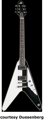 ROCKET | - Flying V-style solid alder body with arched maple top, rock maple neck, 22-fret Indian rosewood fingerboard with dot inlay, three-per-side tuners, tune-o-matic style bridge, stop tailpiece, white pickguard, two humbucker pickups, two knobs, three-way switch, nickel hardware, available in split Black/White finish, disc. 2005. |