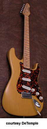 DETEMPLE GUITARS | Guitars currently produced in Sherman Oaks, CA since 1995. | Luthier Michael DeTemple builds electric solidbody guitars based very closely on the 1950s Fender Stratocasters, Telecasters, and Esquires. After many years of playing, repairing, and restoring guitars, he saw how much vintage Fenders were increasing in value and how impracticle they were to play for gigs anymore. He studied every aspect of these old 1950s guitars and started producing guitars called "Vintage Design solidbody electrics." Guitars are part of the Spirit Series and each model is hand-built with several options available. Prices start around $5,750. DeTemple also offers a wide range of vintage-style parts including pickups, wiring kits, saddles, etc. For more information, visit DeTemple's website or contact him directly (see Trademark Index). | |