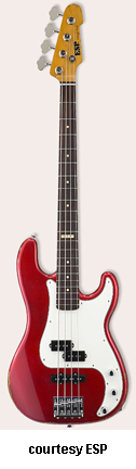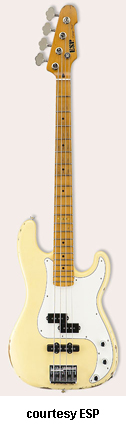 VINTAGE 4 (STANDARD SERIES) | - offset double cutaway P-style alder body, bolt-on U-shaped maple neck, 21-fret maple fingerboard with black dot and 12th fret ESP inlays (Black or Candy Apple Red finish) or rosewood fingerboard with dot and 12th fret ESP inlays (Sunburst or Olympic White finish), four-on-one-side Gotoh tuners, Gotoh adj. bridge, white (Black finish) or tortoiseshell (Sunburst finish) P-style pickguard, single split coil P-style Basslines pickup, three knobs (two v, tone), chrome hardware, available in Distressed 3-Tone Burst, Distressed Black, Distressed Candy Apple Red, or Distressed Vintage White finish, 34 in. scale, mfg. 2007-present. |