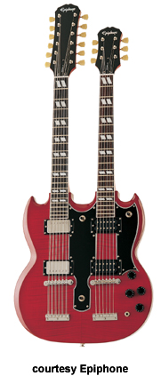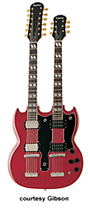 G-1275 STANDARD DOUBLENECK (MODEL EGDS) | - SG-style body, two bolt-on necks (12-string configuration, six-per-side tuners; six-string configuration, three-per-side tuners), available in Cherry finish, disc. 1998. |