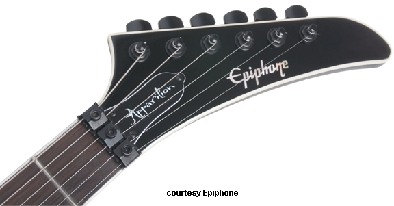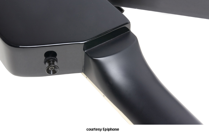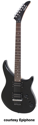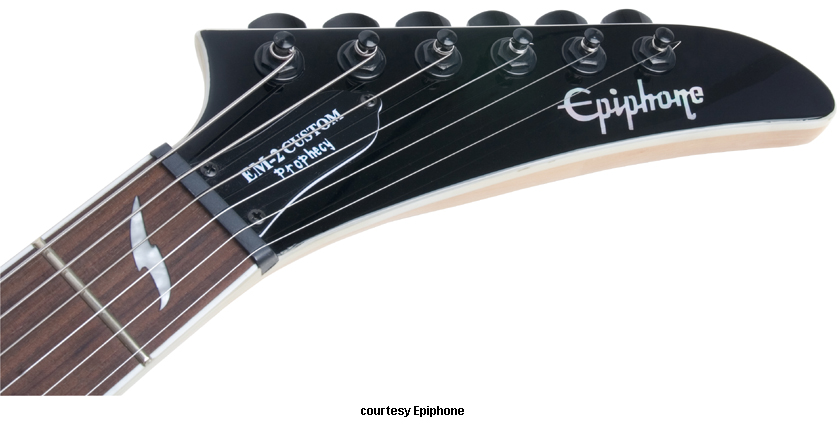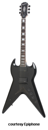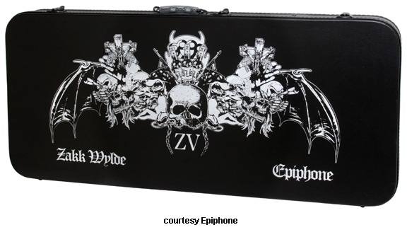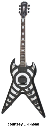ZAKK WYLDE ZV CUSTOM (MODEL ENZV) | - symmetrical double cutaway SG-style body on the top half that blends in to a Flying V-style with wings, solid mahogany body, maple neck, 22-fret bound rosewood fingerboard with large pearl block inlays, multi-ply bound Les Paul-shaped headstock with pearl logo and five-piece split diamond inlays, bell-shaped truss rod cover engraved with "Zakk Wylde Custom", three-per-side Grover kidney tuners, Epiphone LockTone tune-o-matic bridge, STB that runs through a black metal V-shaped plate, two EMG-HZ pickups (EMG HZ-4, EMG HZ-4A), three black speed knobs (two v, tone), three-way pickup switch on bass wing, jack on face of treble wing, black hardware, available in Ebony or Zakk Wylde's trademark Bullseye finish (Ebony with white circles making a bullseye), 24.75 in. scale, custom-designed fitted hard shell case with Zakk Wylde-inspired graphics, new 2009. |