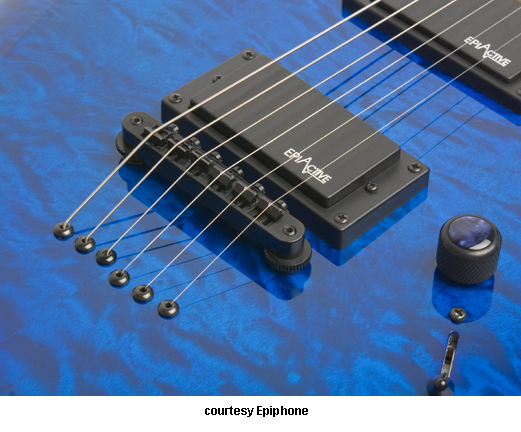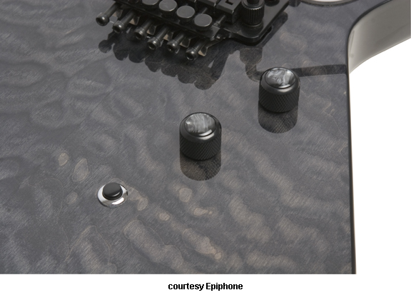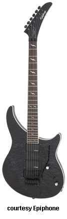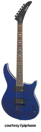 EM-2 CUSTOM PROPHECY EX (EEM2) | - offset swooping double cutaway poplar body, quilted maple top, single-ply top binding, bolt-on hard maple neck, 24-fret bound rosewood 14 in. radius fingerboard with blade inlays, hockey stick-style headstock with black overlay and logo, six-on-one-side tuners, LockTone tune-o-matic bridge, STB, two EpiActive pickups, two metal knobs with pearl inlays (v, tone), five-way pickup switch, black hardware, available in Midnight Sapphire finish, 25.5 in. scale, new 2008. |