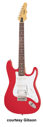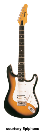 FAT-210 (MODEL EGF2) | - Offset double cutaway (Stratocaster style) laminated alder body, maple neck, 22-fret maple or rosewood fingerboard with dot inlay, 3 pickups (2 single coil, 1 humbucker), tremolo, chrome hardware, available in Ebony, Vintage Sunburst, or Vintage White finishes, disc. 2004. |
