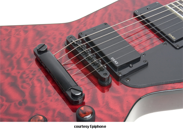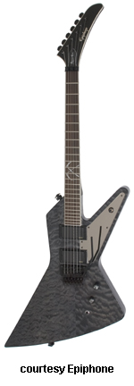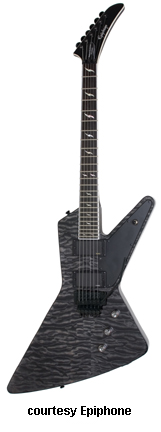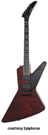 FUTURA CUSTOM PROPHECY EX (EFTS) | - offset hourglass Explorer-style mahogany body, quilted maple top, set mahogany neck, 24-fret bound rosewood 14 in. radius fingerboard with blade inlays, bound hockey stick-style headstock with black overlay and logo, six-on-one-side Grover tuners, black pickguard, LockTone tune-o-matic bridge, LockTone stop tailpiece, two EMG pickups (EMG-81/EMG-85), three metal knobs with pearl inlays (two v, tone), three-way pickup switch, black hardware, available in Black Cherry finish, 24.75 in. scale, new 2008. |