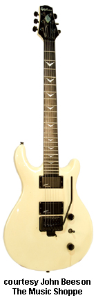 SPOTLIGHT (JAPAN MFG.) | - Slightly offset double cutaway body, set-in neck, rosewood fingerboard with chevron inlays, 3-per-side headstock, 2 humbucker pickups, available in Metallic Black, Metallic Red, Pearl White, and PRS/Alembic type walnut, mfg. 1986-89. |