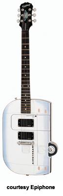 TRAILER PARK TROUBADOUR AIRSCREAMER (MODEL EEAS) | - limited edition guitar shaped like the Airstream trailer, mahogany body, hard maple bolt-on neck, 22-fret rosewood fingerboard with dot inlay, two EMG pickups, chrome hardware, Airstream silver finish, mfg. 2003-05. |
