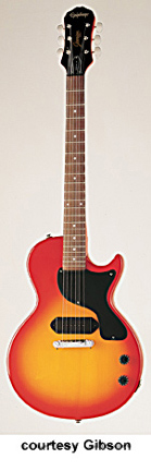 JUNIOR SC (MODEL EGJR) | - Single cutaway laminated alder/maple body, bolt-on mahogany neck, 22-fret rosewood fingerboard with pearl dot inlay, wraparound tune-o-matic bridge, blackface peghead with screened logo, 3-per-side tuners, chrome hardware, black pickguard, dog-ear P-90-style single coil pickup, volume/tone controls, available in Ebony, Cherry, Heritage Cherry Sunburst, TV Yellow, and Vintage Sunburst finishes, mfg. 1997-2000. |