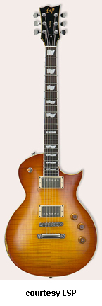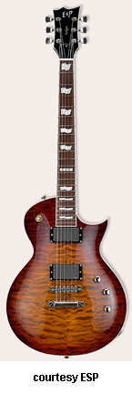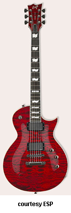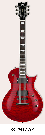 ECLIPSE CUSTOM (ESP CUSTOM SERIES) | - single cutaway mahogany body with quilted maple top, three-piece maple neck, 24-fret ebony fingerboard with flag inlays and 12th fret ESP logo, two EMG-81 humbucker pickups, three-per-side tuners, TonePros System II locking bridge, white with abalone neck binding, natural body binding, three black knobs, switch, black hardware, available in See-Through Black or See-Through Black Cherry finish, mfg. 2003-present. |