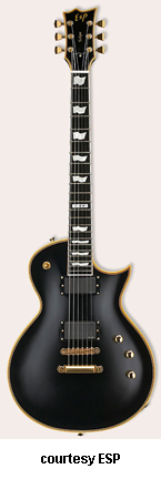 ECLIPSE (SOLID BODY) | - single cutaway mahogany body, bolt-on maple neck, 24-fret bound rosewood fingerboard with pearl dot inlay (logo block inlay at 12th fret), tune-o-matic bridge/stop tailpiece, three-per-side tuners, bound headstock, chrome hardware, two ESP LH-200 humbucker pickups with nickel covers, volume/2-Tone controls, three-position switch, available in Black, Gunmetal Blue, Metallic Gold, or Pearl White finish, mfg. 1995-2000. |