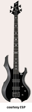 ESP | ELECTRIC BASS: SIGNATURE SERIES | | TOM ARAYA BASS | - offset double cutaway gothic look, alder body and maple neck, ebony fingerboard with pentagram position markers, Slayer logo at 12th fret, black hardware, two-per-side tuners, Gotoh 206 bridge, 24 XJ frets, two EMG-35-DC pickups, volume, pan, EMG-BQS, Active EQ, available in Black finish, mfg. 2001-present. |