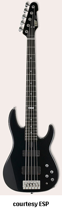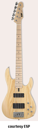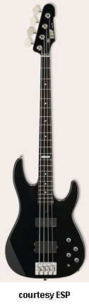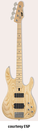 SURVEYOR II (STANDARD SERIES) | - offset double cutaway (P-Bass style), ash body, bolt-on maple neck, 21 XJ fret maple or ebony fingerboard with dot inlayand ESP logo in 12th fret, matching headstock, four-on-one-side tuners, Wikinson bridge, EMG MMTW/35-P4 pickups, four knobs, chrome hardware, available in Black or Natural finish, mfg. 2004-present. |