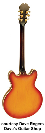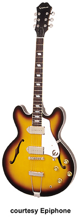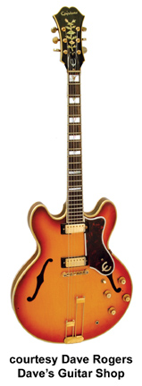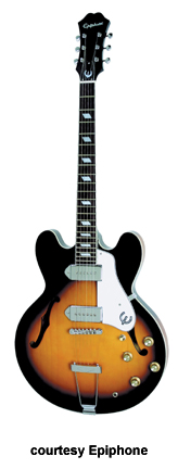 CASINO (TWO PICKUPS) | - thin double rounded cutaway hollow body, bound laminate body, bound fingerboard with dot inlay, tune-o-matic bridge/trapeze tailpiece, white three-ply pickguard, two P-90 pickups, volume/tone controls, pickup selector switch, available in Royal Tan or Sunburst finish, 24.75 in.scale, 16 in.body width, mfg. 1962-69. |