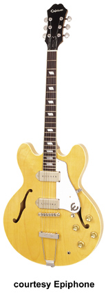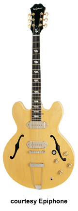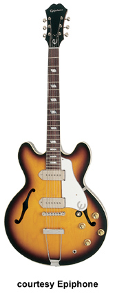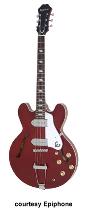 CASINO REISSUE (MODEL ETCA) | - contemoprary re-issue of the Casino Two Pickup Model, select spruce top, laminated maple back and sides, bound body, two f-holes, set maple neck, 20-fret bound rosewood fingerboard with parallelogram inlays, black headstock with three-per-side tuners, tune-o-matic bridge, trapeze tailpiece, white pickguard with E logo, two Alnico P-90 pickups, four knobs (two v, two tone), three-way switch, chrome hardware, available in Black Metallic (disc.), Cherry, Ebony (disc.), Gold Flake (disc.), Metallic Burgundy Mist (disc.), Metallic Light Blue (disc.), Natural, Silver Flake (disc.), Turquoise (disc.), Vintage Cherry Sunburst (disc.), or Vintage Sunburst finish, 25.5 in. scale, mfg. 1995-present. |