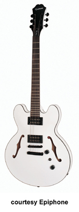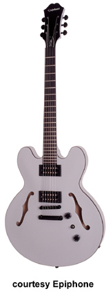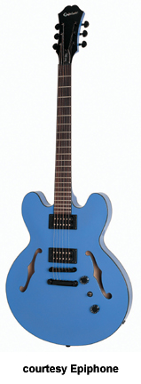 DOT STUDIO (MODEL EDTS) | - 335-style double cutaway semi-hollow body archtop body, laminated maple top, back, and sides, black body binding, set maple neck, 22-fret rosewood fingerboard, black headstock with three-per-side tuners, tune-o-matic bridge, stop tailpiece, two exposed Alnico pickups, two knobs (v, tone), three-way pickup selector, black hardware, available in Alpine White (2004-06), Black, Dolphin Gray (2004 only), Ice Blue (2004 only), Lemon (2004 only), Tomato (2004 only), Worn Brown (2004-06), Worn Cherry (2004-06), or Worn Vintage Sunburst (2004-06) finish, 24.75 in. scale, mfg. 2004-08. |
