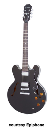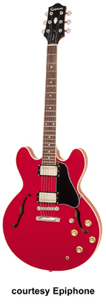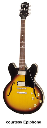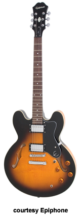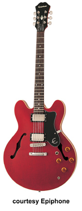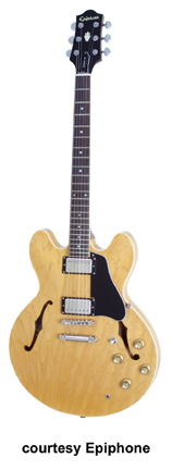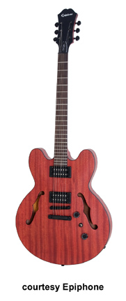 DOT (MODEL ETDT) | - 335-style double cutaway semi-hollow body archtop body, laminated maple top, back, and sides, set maple neck, 22-fret rosewood fingerboard with dot position markers, black headstock with three-per-side tuners, tune-o-matic bridge, stop tailpiece, two covered humbucker pickups, four knobs (two v, two tone), three-way pickup selector, nickel hardware, available in Cherry, Ebony, Natural, and Vintage Sunburst finish, 24.75 in. scale, mfg. 2000-present. |