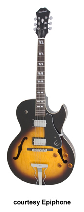 ES-175 REISSUE (MODEL ET75) | - reissue of the Gibson ES-175, single sharp cutaway deep body, maple top, laminated maple back and sides, two f-holes, body and neck white binding, set maple neck, 22-fret rosewood fingerboard with split parallelogram inlays, black headstock with flowerpot inlay and three-per-side tuners, adj. rosewood bridge, trapeze tailpiece, raised black pickguard, two covered humbucker pickups, four knobs (two v, two tone), three-way switch, chrome hardware, available in Vintage Sunburst, 24.75 in. scale, mfg. 2006-present. |