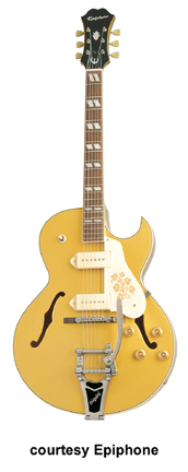ES-295 (MODEL ET29) | - design based on the Gibson ES-295, hollowbody with single Florentine cutaway, laminated maple top, back, and sides, bound body and neck, mahogany set neck, 22-fret rosewood fingerboard with split parallelogram inlays, flowerpot headstock inlay, three-per-side tuners with pearl buttons, adj. rosewood bridge, licensed Bigsby tailpiece, raised white pickguard with floral designs, two Alnico P-90 pickups, four knobs (two v, two tone), three-way pickup selector, chrome hardware, available in Metallic Gold finish, 24.75 in. scale, mfg. 1998-2000, 2003-08. |
