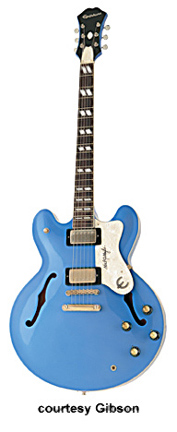 EPIPHONE | ELECTRIC ARCHTOP: NOEL GALLAGHER SUPERNOVA SERIES | | NOEL GALLAGHER SUPERNOVA (MODEL ETSN) | - double cutaway semi-hollow ES-335 style body, laminated maple back, sides, and top, set maple neck, 22-fret rosewood fingerboard with split parallelogram inlays, three-per-side tuners, tune-o-matic bridge, stop tailpiece, raised pickguard with Noel Gallagher signature, two covered humbucker pickups, four knobs (two v, two tone), three-way switch, available in Ebony (1997-2000), Cherry (1997-2000), Metallic Light Blue, and Vintage Sunburst (1997-2000) finish, mfg. 1997-2005. |