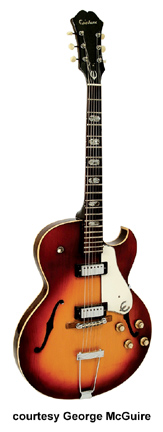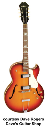 EPIPHONE | ELECTRIC ARCHTOP: SORRENTO SERIES | | SORRENTO (ONE PICKUP) | - thin single pointed cutaway body, dot fingerboard inlay, tune-o-matic bridge/trapeze tailpiece, tortoiseshell pickguard, metal peghead logo plate, nickel hardware, mini-humbucker pickup, volume/tone controls, pickup selector switch, available in Natural, Sunburst, or Royal Tan finish, 16.25 in. body width, 24.75 in. scale, mfg. 1960-1970. |