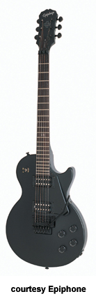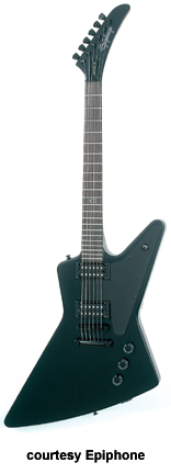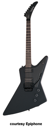 EPIPHONE | ELECTRIC: E "GOTHIC" SERIES | Add $40 for Floyd Rose Tremolo on the Explorer, Flying V, and Les Paul Studio Gothics. | 1958 GOTHIC EXPLORER (MODEL EXP2) | - Explorer body style, mahogany body and set neck, ebony fingerboard with side markers, XII inlay at 12th fret, two exposed coil humbucker pickups, black pickguard, black hardware, available in Black Satin finish, mfg. 2002-present. |