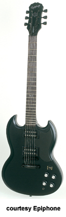 GOTHIC G-400 (MODEL EGG4) | - G-400 (SG) body style, mahogany body and set neck, ebony fingerboard with side markers, XII inlay at 12th fret, two exposed coil humbucker pickups, black pickguard, black hardware, available in Black Satin finish, mfg. 2002-present. |