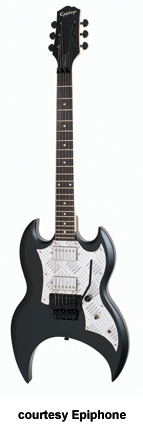 1958 GOTHIC FLYING V (MODEL EGV2) | - Flying V-style based on a 1958 Gibson Flying V, mahogany body, set mahogany neck, 22-fret ebony fingerboard with "XII" inlay at 12th fret, arrow-shaped headstock, three-per-side tuners, tune-o-matic bridge, V-shaped metal tailpiece with STB, black pickguard, two exposed coil humbucker pickups, three knobs (two v, tone), three-way pickup switch, jack on face of guitar, black hardware, available in Black Satin finish, 24.75 in. scale, mfg. 2002-06. |