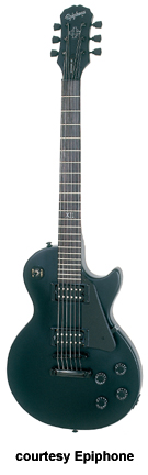 GOTHIC LES PAUL STUDIO (MODEL ENL1) | - Les Paul body style, mahogany body and set neck, ebony fingerboard with side markers, XII inlay at 12th fret, two Alnico V exposed coil humbucker pickups, black pickguard, black hardware, available in Black Satin finish, mfg. 2002-present. |