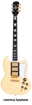 G-400 Custom (Model EGG5) | - similar to G-400, except has 3 covered humbuckers, white pickguard, gold hardware, fingerboard block inlays, bound neck and headstock, available in Antique Ivory finish, mfg. 1998-2000, reintroduced 2003-present. |