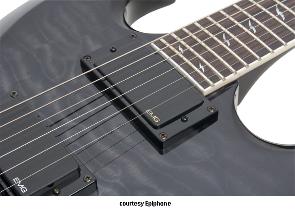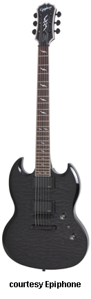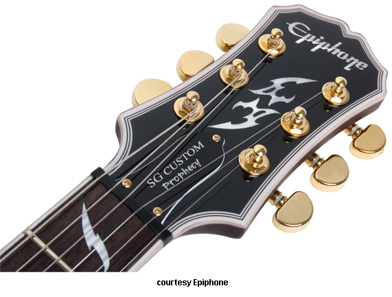 SG CUSTOM PROPHECY EX (EGSE) | - double pointed cutaway SG-style mahogany body, quilted maple top, set mahogany neck, 24-fret bound ebony 14 in. radius fingerboard with blade inlays, multi-ply bound headstock with black overlay, logo, and custom blade inlay, three-per-side Grover tuners, LockTone tune-o-matic bridge, LockTone stop tailpiece, two EMG pickups (EMG-81/EMG-85), two metal knobs with pearl inlays (v, tone), three-way pickup switch, black hardware, available in Midnight Ebony finish, 24.75 in. scale, new 2008. |