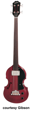 EB-1 (MODEL EBB1) | - viola-shaped mahogany body, bolt-on mahogany neck, painted on f-hole, 32 in. scale, 20-fret rosewood fingerboard with pearl dot inlay, fixed bridge, blackface peghead with screened logo, 2-per-side tuners, chrome hardware, raised black pickguard, chrome-covered Sidewinder humbucker pickup, volume/tone controls, available in Red Brown Mahogany finish, mfg. 1998-2000. |