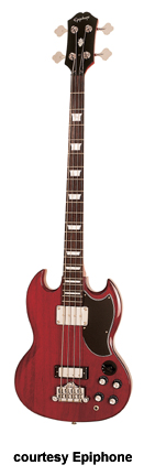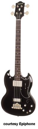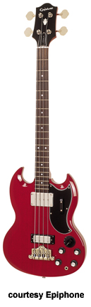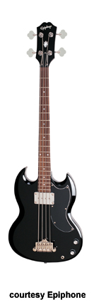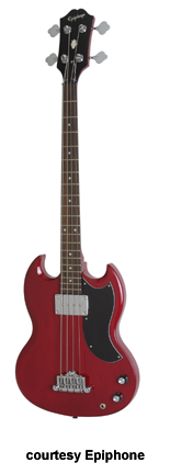 EB-0 (MODEL EBGO, SG-1) | - offset double cutaway mahogany body with pointy forward horns, bolt-on mahogany neck, 20-fret rosewood fingerboard with pearl dot inlay, fixed bridge, blackface peghead with screened logo, two-per-side tuners, chrome hardware, black pickguard, chrome-covered Sidewinder humbucker pickup, volume/tone controls, available in Cherry or Ebony finish, 30 in.scale, mfg. 1998-present. |