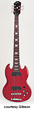 EB-3 5-STRING (MODEL EBG5) | - SG body style, 3/2 headstock configuration, set neck, trapezoid inlays, 2 DualRail pickups, 5-way rotary tone selector switch, stop tailpiece, chrome hardware, available in Cherry or Ebony finishes, mfg. 2000-01. |
