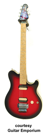 EDWARD VAN HALEN | - single cutaway basswood body, bound figured maple top, bolt-on maple neck, 22-fret maple fingerboard with black dot inlay, strings through bridge, 4/2-per-side Schaller tuners with pearl buttons, chrome hardware, two humbucker DiMarzio pickups, volume control (with tone knob!), three-position switch, available in Trans. Gold, Trans. Purple, or Trans. Red finish, mfg. 1991-95. |
