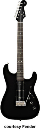 AERODYNE STRATOCASTER (JAPAN MFG. NO. 025-6505) | - offset double cutaway basswood body with unique carved top, bolt-on maple neck, 21-fret rosewood fingerboard with dot inlay, matching color headstock, six-on-one-side tuners, vintage style vibrato bridge, no pickguard, three single coil pickups, three knobs (v, two tone), five-way switch, chrome hardware, available in Black finish, mfg. 2005-06. |