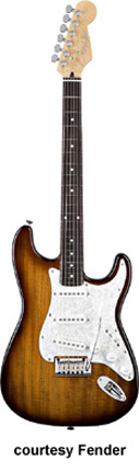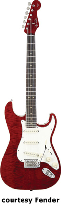 KOA STRATOCASTER (KOREA MFG., NO. 026-5106) | - offset double cutaway alder body with a koa top, bolt-on C-shaped birds-eye maple neck, 22-fret maple fingerboard with dot inlay, six-on-one-side tuners, synchonized tremolo, three-ply white pickguard, three single coil Seymour Duncan pickups, three knobs (v, two tone), five-way switch, chrome hardware, available in Light Burst/Antique Burst finish, 25.5 in. scale, mfg. 2006-08. |