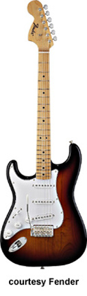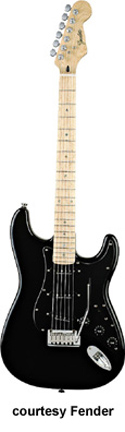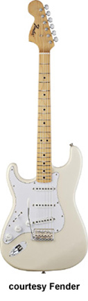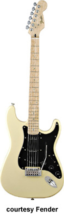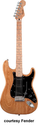 LITE ASH STRATOCASTER (KOREA MFG. NO. 026-5002) | - offset double cutaway lightweight ash body, bolt-on bird's-eye maple C-Shaped neck, 22-fret bird's-eye maple neck with dot abalone inlays, single-ply black pickguard, vibrato bridge, three Seymour Duncan single coil pickups with black covers, three knobs (v, two tone), five-way switch, chrome hardware, available in Black, Natural, or Vintage White finish, mfg. 2004-08. |