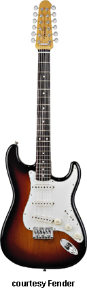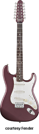 STRATOCASTER 12-STRING (JAPAN MFG. NO. 027-8900) | - 12-string configuration, offset double cutaway alder body, bolt-on maple C-shaped neck, 21-fret rosewood fingerboard with dot inlays, 12-string-style headstock with six-per side tuners, hard-tail bridge, three-ply white pickguard, three vintage-style single coil pickups, three knobs (v, two tone), five-way switch, available in 3-Color Sunburst, Burgundy Mist, or Lake Placid Blue finish, mfg. 2005-present. |