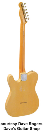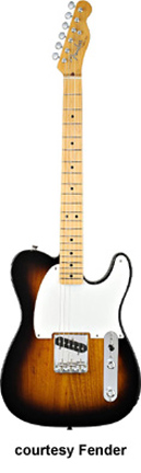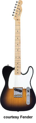 '54 ESQUIRE REISSUE (JAP. MFG.) | - single cutaway ash body, black pickguard, bolt-on maple neck, 21-fret maple fingerboard with black dot inlay, strings through bridge with cover, six-on-one-side tuners, chrome hardware, single coil pickup, two knobs (v, tone), three-position switch, controls mounted metal plate, available in Blonde and 2 Tone Sunburst finish, disc. 1994. |
