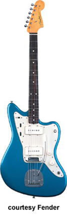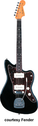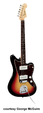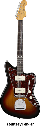 JAZZMASTER (U.S. MFG.) | - offset double cutaway asymmetrical alder body, gold metal (or tortoiseshell) pickguard, bolt-on maple neck, 21-fret rosewood fingerboard with pearl dot inlay, six-on-one-side tuners, floating bridge/vibrato, bridge cover plate, tortoiseshell celluloid pickguard, two single coil exposed pickups, two knobs (v, tone) and a three-position pickup switch on the treble side of pickguard, two roller knobs (v, tone) and a preset selector slide switch on bass side of pickguard, chrome hardware, available in Sunburst or Custom Colors finishes, mfg. 1958-1980. |