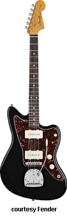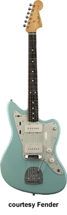 '62 JAZZMASTER (U.S. MFG. NO. 010-0800) | - alder contoured body with offset waist based on the 1962 Jazzmaster, bolt-on maple neck, 21-fret rosewood fingerboard, Strat-style headstock with six-on-one-side vintage style tuners, vintage style floating tremolo with tremolo lock button, brown tortoiseshell or aged white/black/white pickguard, two US Jazzmaster pickups, two knobs (v, tone) and a three-way pickup switch on the treble side of pickguard, two roller knobs (v, tone) and one three-way lead/rhythm selector switch on bass side of pickguard, chrome hardware, available in 3-Color Sunburst, Black, Candy Apple Red (1999-2000), Dakota Red (2001 only), Fiesta Red (1999-2000), Ice Blue Metallic (2001-disc.), Inca Silver (2001-disc.), Olympic White, Ocean Turquoise (2002-07), Sherwood Metallic (1999-2000), or Surf Green (2002-07) finish, 25.5 in. scale, case included, mfg. 1999-present. |