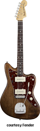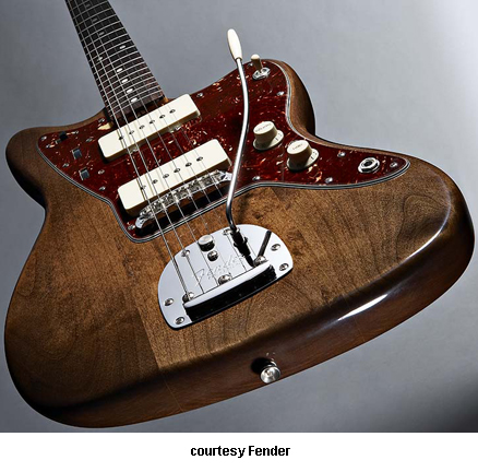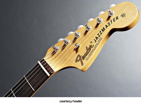 ELVIS COSTELLO JAZZMASTER (U.S. MFG. NO. 011-5900) | - offset double cutaway Jazzmaster-style alder body, bolt-on maple C-shaped neck, 21-fret rosewood 7.25 in. radius fingerboard with white dot inlays, transition-style Fender logo on headstock and Elvis Costello signature on back of headstock, six-on-one-side Gotoh vintage-style tuners, individual adj. saddle bridge, vintage-style floating tremolo with locking button and the tremolo arm is adjusted higher to allow for more travel and deeper bends, four-ply tortoise pickguard, two special design American Vintage Jazzmaster single coil pickups, two knobs (v, tone), three-way pickup switch, one two-way slider switch (lead/rhythm circuit), two roller knobs (v, tone), aged white plastic parts, chrome hardware, available in Walnut finish, deluxe brown hardshell case, strap, and cable included, 25.5 in. scale, mfg. summer 2008-present. |