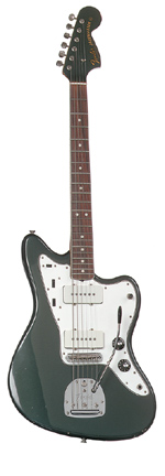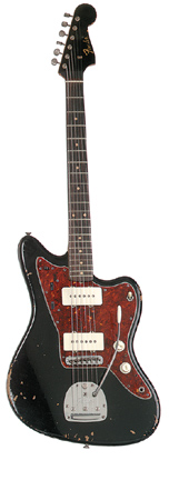 JAZZMASTER VENTURES LIMITED EDITION (JAP. MFG., NO. 027-8200) | - offset double cutaway asymmetrical light ash body, bolt-on maple neck, 22-fret rosewood fingerboard with white block inlay, six-on-one-side tuners, floating bridge/vibrato, bridge cover plate, white tortoiseshell pickguard, two Seymour Duncan JM single coil pickups, two knobs (v, tone) and a three-way pickup switch on the treble side of pickguard, two roller knobs (v, tone) and one three-way lead/rhythm selector switch on bass side of pickguard, gold hardware, available in Midnight Black Trans. finish, mfg. 1996 only. |
