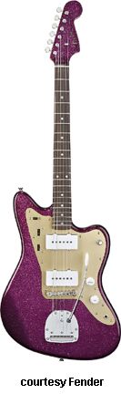 J MASCIS JAZZMASTER (JAP. MFG. NO. 025-5800) | - offset double cutaway basswood body, bolt-on maple C-shaped neck, 21-fret rosewood fingerboard with dot inlays, matching finish headstock with J Mascis signature on back of headstock and six-on-one-side Gotoh vintage-style tuners, Adjusto-Matic bridge with vintage-style floating vibrato and vibrato lock button, two special design MIJ single-coil Jazzmaster pickups, gold anodized pickguard, two knobs (v, tone), three-way pickup switch, two-way lead/rhythm tone switch, two roller knobs, chrome hardware, available in Purple Sparkle finish, 25.5 in. scale, mfg. summer 2007-present. |