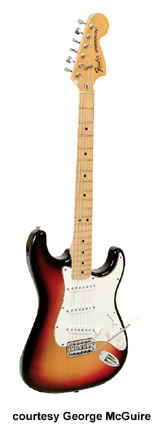 STRATOCASTER (CBS MFG. 1965-1971) | - offset double cutaway alder body with smaller body contours, bolt-on four-screw maple neck, 21-fret rosewood fingerboard with clay off-white dot inlays, large Strat-style headstock, six-on-one-side tuners, tremolo bridge, three-layer plastic white pickguard, three single coil staggered height pickups, three knobs (v, two tone), three-way pickup switch, jack angled into the top, nickel hardware, available in standard 3-Tone Sunburst finish or various custom color finishes, mfg. 1965-1971. |