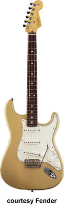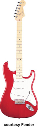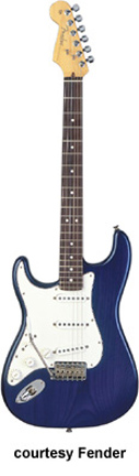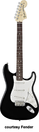 FENDER | Stratocaster: Highway 1 Series (2002-Current Mfg.) | The U.S. Special Highway 1 Stratocaster series was released at the Summer 2002 NAMM show. This is an American Stratocaster brought back to the basics. It retails low enough so it can be purchased at $900 by Fender's MAP price! | HIGHWAY 1 STRATOCASTER (NO. 011-1100/1102/1160/1162) | - offset double cutaway alder body, bolt-on maple neck, 22 medium jumbo-fret maple (1102/1162) or rosewood (1100/1160) fingerboard with dot inlays, Fender Cast/sealed tuning machines, Fender Synchronized tremolo, three single coil Alnico pickups, three knobs (v, two tone), five-way switch, satin lacquer finish, available in 3-Color Sunburst, Black (2006-present), Daphne Blue (2006-07), Cocoa Trans. (disc. 2004), Crimson Red Trans. (2002-06), Honey Blonde Trans., Sapphire Blue Trans. (2002-06), Teal Green Trans. (disc. 2004), or Wine Trans./Midnight Wine (2006-present) finish, gigbag included, 25.5 in. scale, mfg. 2002-present. |