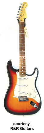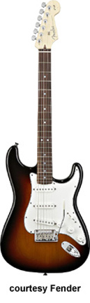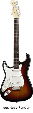 60TH ANNIVERSARY AMERICAN STRATOCASTER (U.S. MFG. 011-6000) | - alder body, bolt-on C-shaped maple neck, 22-medium jumbo frets with rolled edges, rosewood fingerboard with dot inlay, six-on-one-side Schaller tuners, Synchronized tremolo, three-ply white pickguard, three New American Vintage Strat single coil pickups, three knobs (v, two tone), five-way switch, stamped 60th Anniversary neck plate, cubic Zirconium inlaide headstock emblem, commermative 60th Anniversary case, chrome hardware, 3-Color Sunburst, 25.5 in. scale, mfg. 2006 only. |