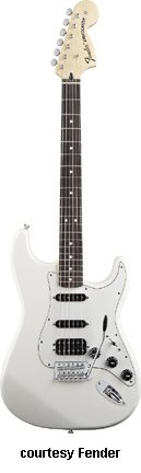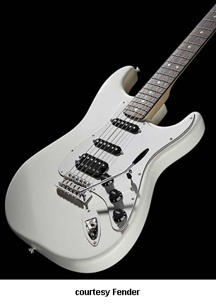 DELUXE FAT STRAT (HSS, MEX. MFG., NO. 013-3100) | - poplar (1998-2006) or alder (2008-present) offset double cutaway body, bolt-on maple neck, 21-fret rosewood fingerboard with white dot inlays, large 70s-style headstock with six-on-one-side tuners, synchronized tremolo, three-ply B/W/B or W/B/W pickguard, two Tex-Mex single coil and one Tex-Mex humbucker pickups (HSS), three knobs (v, two tone), five-way pickup switch, chrome hardware, available in Arctic White with black plastic parts (1998-2001, 2008-present), Black with white plastic parts, or Pewter (1998-2006) finish, gigbag included, 25.5 in. scale, mfg. 1998-2006, reintroduced late 2007-present. |