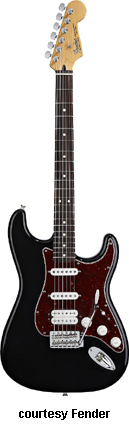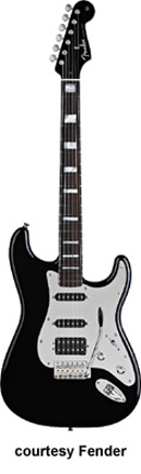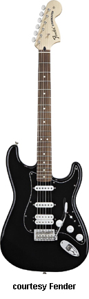 DELUXE POWER STRAT (MEX. MFG. NO. 013-9300) | - alder body, bolt-on maple C-shaped neck, 21-fret rosewood fingerboard with dot inlay, six-on-one-side Fender/Ping vintage tuners, six-saddle Fishman Power Bridge with tremolo, four-ply tortoiseshell pickguard, two Tex-Mex Strat single coil and one Tex-Mex Strat humbucker pickups HSS, three knobs (v, tone, Fishman tone), chrome hardware, available in 2-Color Sunburst, Black, or Honey Blonde finish, 25.5 in. scale, gigbag included, mfg. 2006-present. |