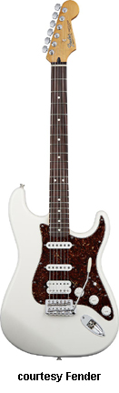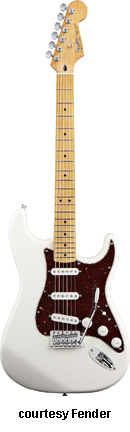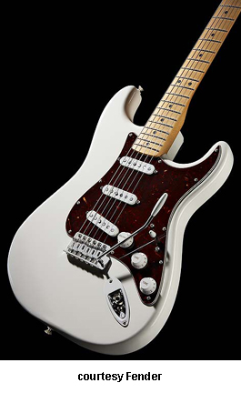 DELUXE LONE STAR STRATOCASTER (MEX. MFG. NO. 013-9410) | - offset double cutaway alder body, bolt-on maple neck, 21-fret rosewood fingerboard with white dot inlays, standard Fender Strat-style headstock with six-on-one-side Ping vintage-style tuners, vintage-style synchronized tremolo, four-ply brown shell pickguard, two Texas Special single coil and one Seymour Duncan Pearly Gates humbucker pickups (HSS), three knobs (v, two tone), five-way pickup switch, chrome hardware, available in Arctic White, Black, or Brown Sunburst finish, 25.5 in. scale, deluxe gig bag included, mfg. late 2007-present. |