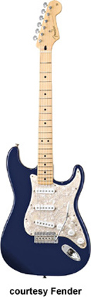 DELUXE POWERHOUSE STRAT (MEX. MFG., NO. 013-9500/9502) | - poplar body, 21-fret maple (9502) or rosewood (9500) fingerboard with black dot inlay, vintage-style tremolo, chrome hardware, white tortoiseshell pickguard, three Powerhouse ultra quiet single coil pickups (with hum-cancelling slave coil), three knobs (master volume/master "no-load" tone/active 12 dB mid-range boost controls), available in Arctic White, Black, Blizzard Pearl (2005-07), Candy Apple Red (disc. 2005), Caramel Metallic (2005-present), Chrome Red (2005-07), Graffiti Yellow (disc. 2005), Lake Placid Blue (disc. 2005), Navy Blue Metallic (2005-07), or Pewter (disc. 2005) finish, gigbag included, 25.5 in. scale, mfg. 1998-2007. |